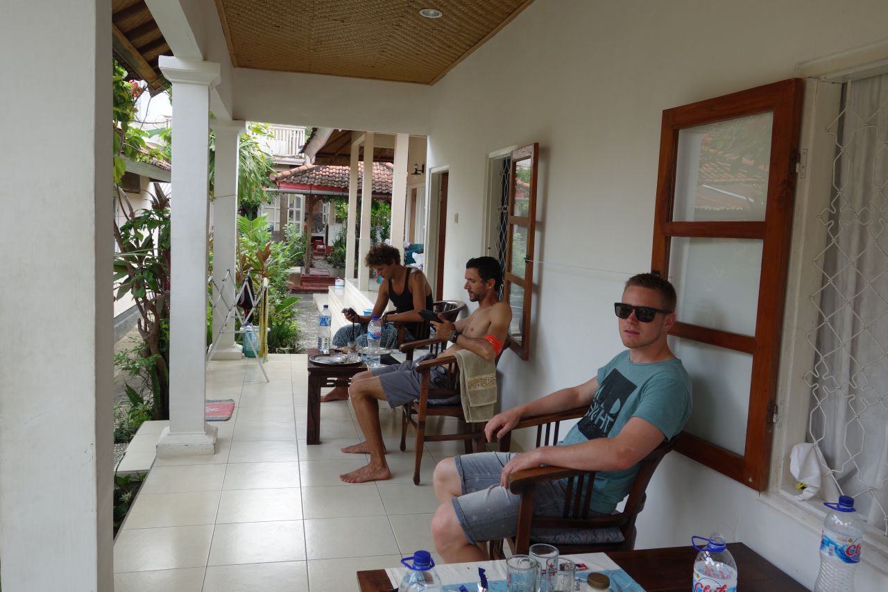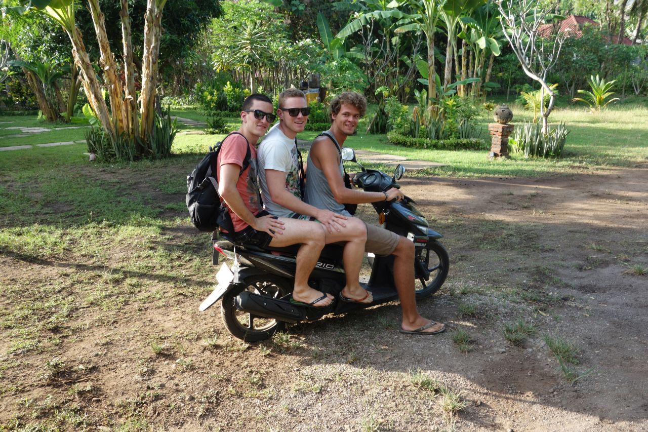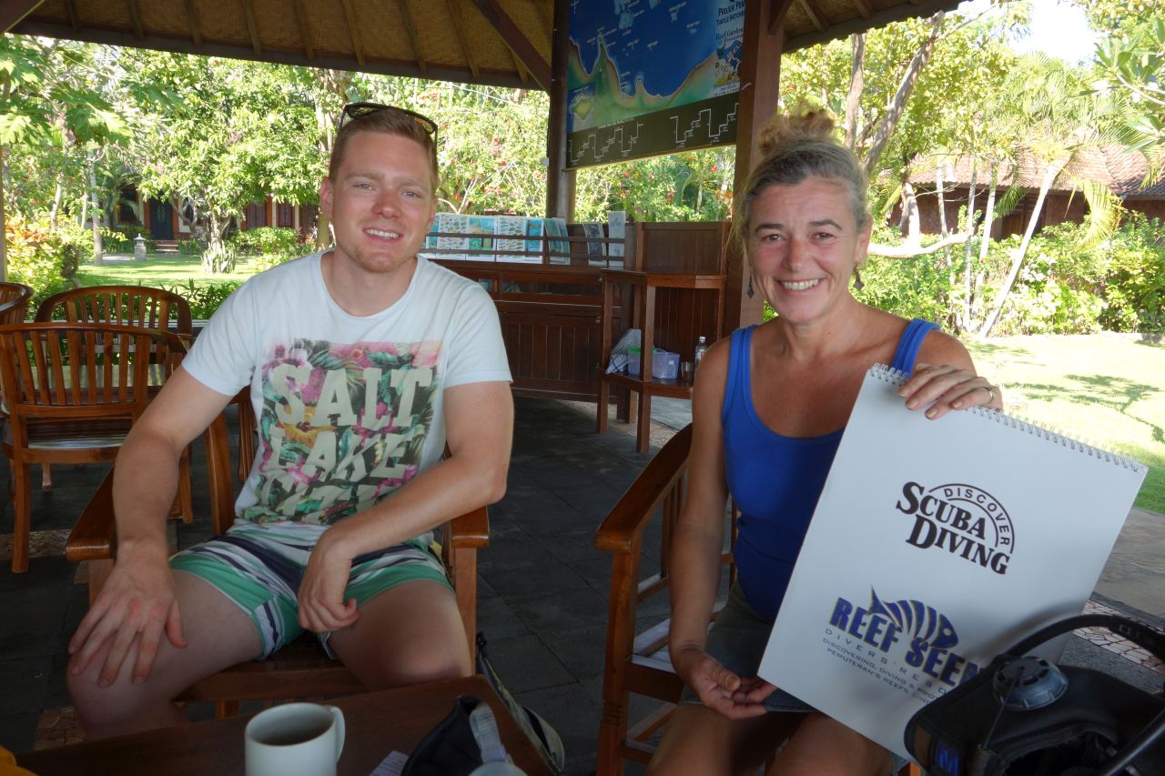 Zu dritt mit drei Rucksäcken schlingerten wir auf einem Roller durch die Gegend. Die tiefen Sicherheitsstandards in Indonesien bringen auch ihre Vorteile J. Wir suchten uns eine günstige Bleibe und fanden abseits ein gemütliches Homestay mit kleinen Bungalows. Die Preise hier sind deutlich höher und wir bezahlen horrende 15 Fr. pro Nacht und Zimmer. Wir waren primär zum Tauchen und Sonnenbaden hier und suchten uns als Erstes einen Tauchanbieter. Zum Glück haben wir erste, günstige Angebote ausgeschlagen und haben ein geniales Dive Center namens Reef Seen gefunden. Die „very british“ Betreiberin Amanda empfing uns mit ihrem Königshausenglisch und ich habe sie von Anfang an ins Herz geschlossen, eine liebenswürdige Frau, die das Ganze sehr professionell betreibt. Hier buchten wir einen Introduction-Dive für Ivo, der noch nie Tauchen war und ein Refresh-Kurs für mich, da mein letzter Tauchgang schon drei Jahre zurückliegt und ich kaum noch mehr wusste, als das man halt Luft aus der Flasche atmen muss.