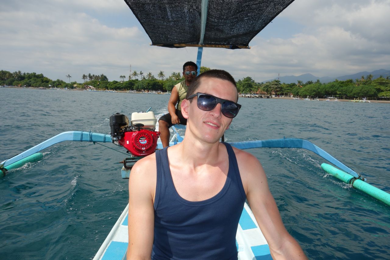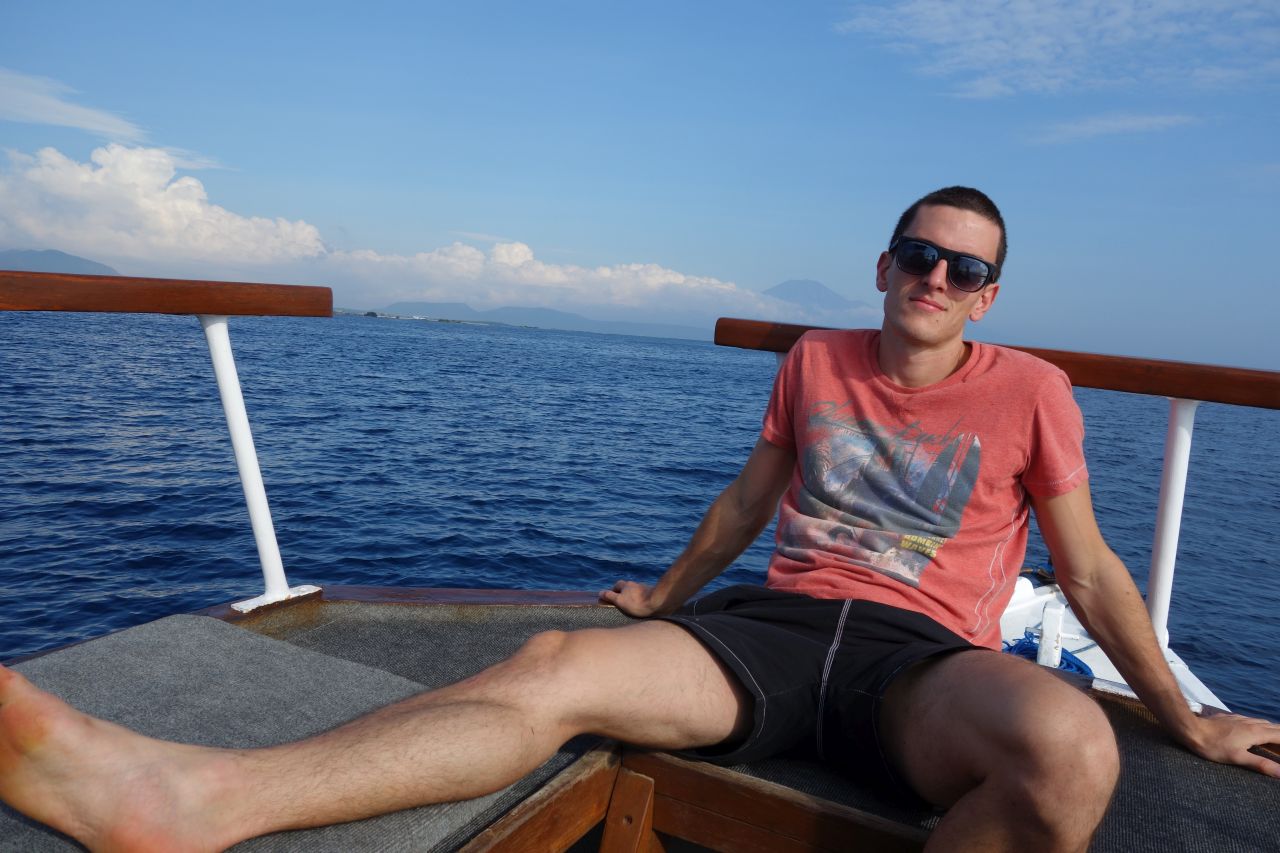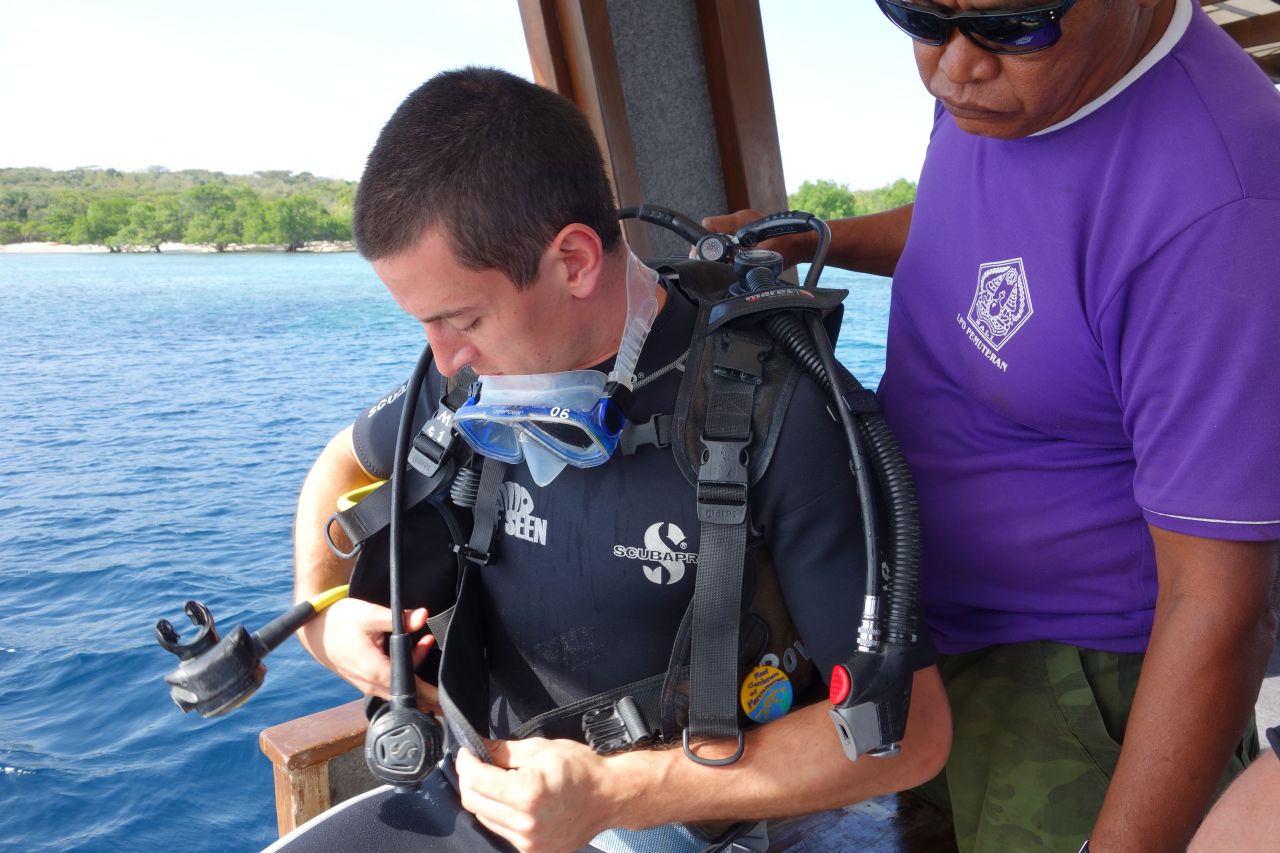 Zu dritt mit drei Rucksäcken schlingerten wir auf einem Roller durch die Gegend. Die tiefen Sicherheitsstandards in Indonesien bringen auch ihre Vorteile J. Wir suchten uns eine günstige Bleibe und fanden abseits ein gemütliches Homestay mit kleinen Bungalows. Die Preise hier sind deutlich höher und wir bezahlen horrende 15 Fr. pro Nacht und Zimmer. Wir waren primär zum Tauchen und Sonnenbaden hier und suchten uns als Erstes einen Tauchanbieter. Zum Glück haben wir erste, günstige Angebote ausgeschlagen und haben ein geniales Dive Center namens Reef Seen gefunden. Die „very british“ Betreiberin Amanda empfing uns mit ihrem Königshausenglisch und ich habe sie von Anfang an ins Herz geschlossen, eine liebenswürdige Frau, die das Ganze sehr professionell betreibt. Hier buchten wir einen Introduction-Dive für Ivo, der noch nie Tauchen war und ein Refresh-Kurs für mich, da mein letzter Tauchgang schon drei Jahre zurückliegt und ich kaum noch mehr wusste, als das man halt Luft aus der Flasche atmen muss.
