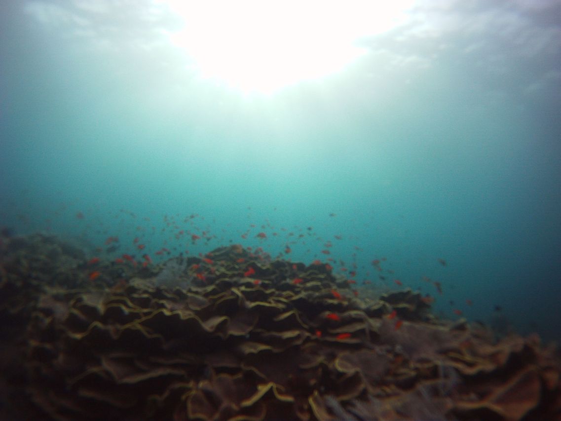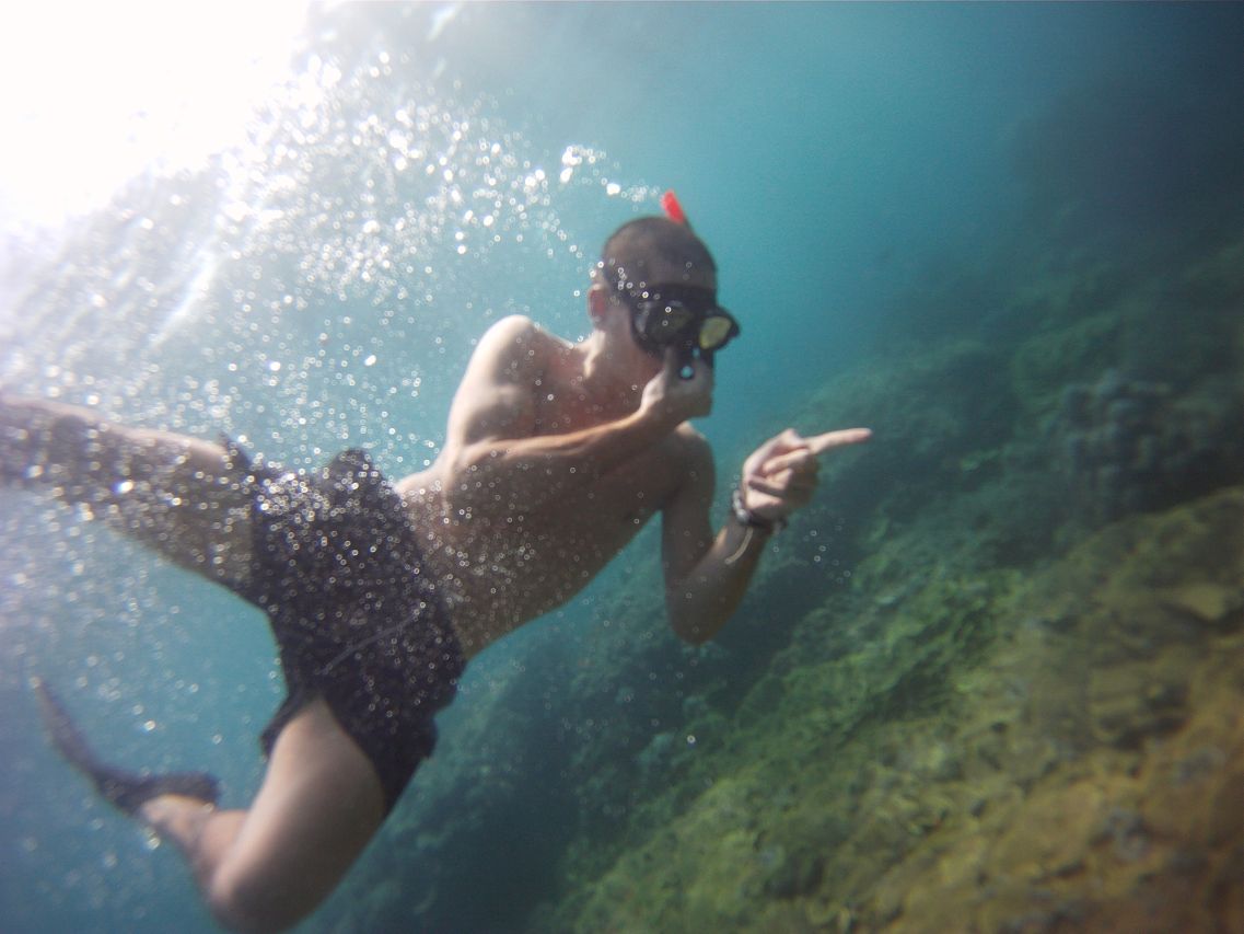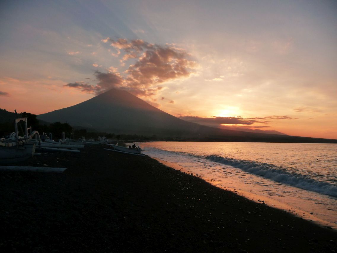 Gut ausgeschlafen machten wir uns dann auf den Weg und reisten mit einem Dutzend Bussen an die Ostküste von Bali. In dem kleinen Dorf Jemeluk an der Küste von Amed fanden wir eine süsse, kleine Bleibe, direkt am Strand. Vor uns rauscht die Brandung im schwarzen Vulkansand und hinter uns ragt der mächtige Gunung Agung in die Höhe. Der 3200m hohe Vulkan sitzt still und erhaben hinter unserem Häuschen und ist so freundlich, alle Wolken aus der Umgebung bei sich zu behalten. Wir liehen uns ein Set Schnorchel aus und erkundeten das Riff vor der Küste. Dabei stiessen wir auf einen eigenartigen, riesigen Unterwasser-Kopfsalat, der von einer Vielzahl kleiner Fische bewohnt wird. Neu in unserem Technikarsenal ist eine GoPro Kamera vertreten, mit der wir euch wunderbare Unterwasseraufnahmen liefern können.