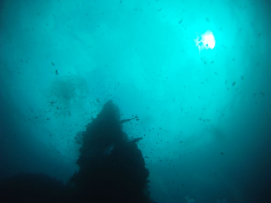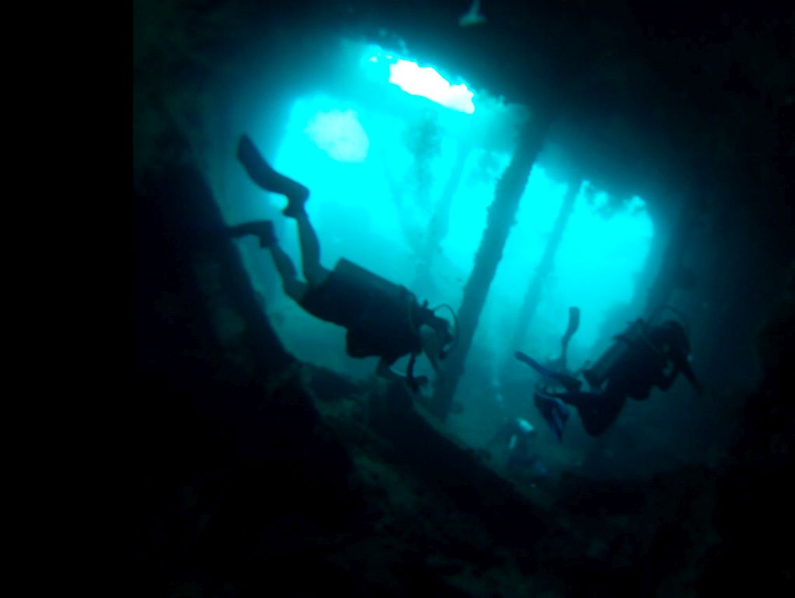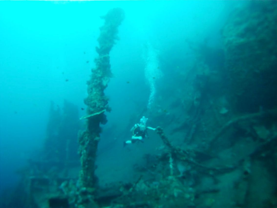 Wir sanken in die Tiefen des Meeres und schon bald tauchten vor uns erste Teile des mythischen Schiffswracks auf. Das 120m lange Transportschiff ist zur Seite gekippt und wird nach all den Jahren von eine Vielzahl Meerestiere und Korallen bewohnt. Wir tauchten gemächlich um und durch das riesige Schiff und ich malte mir Szenen aus, wie es hier einmal ausgesehen haben könnte. Das Highlight war, durch den halboffenen Laderaum zu schweben, der wohl einst Nachschübe für die Alliierten beherbergte.