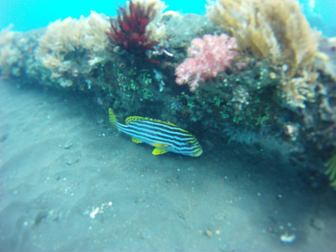 Nach einem feinen Abendessen und langen Schlaf starteten wir am nächsten Tag das grosse Abenteuer, für welches wir an eben diesen Ort im Osten Balis fuhren. Wir haben zwei Tauchgänge gebucht, einen davon zum Wrack der USS Liberty. Dieses Schiff der US Marine wurde im 2. Weltkrieg von einem japanischen U-Boot torpediert und ging unter. Touristenfreundlich sank es gleich 50m vor der Küste. Dass der 2. Weltkrieg auch vor den Küsten Indonesiens tobte, wusste ich nicht.