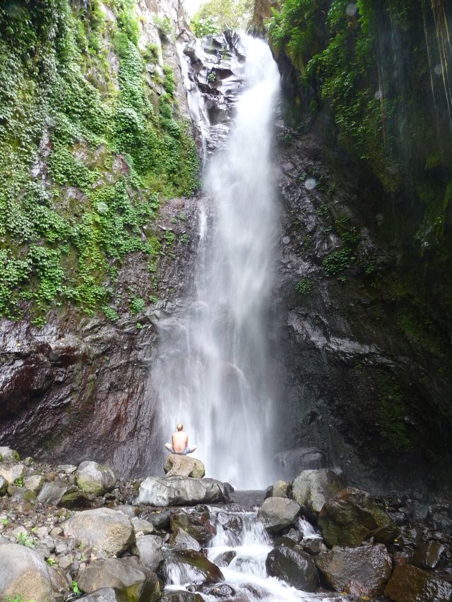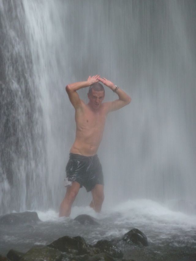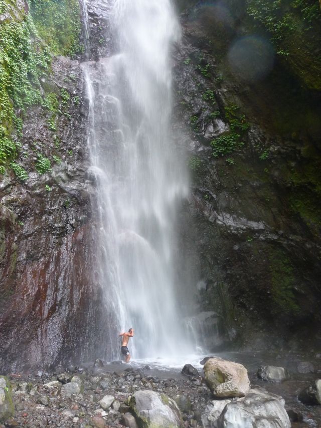 Am nächsten Tag wollten wir vorerst über Wasser bleiben und machten uns auf, das Inland zu erkunden. Der Chef von unserem 1-Zimmer-Homestay hat einen Bruder, dessen Onkel seine Schwester oder so einen Roller hat und mit diesem begaben wir uns auf den Weg. Das alte Klapperding sollte noch zu Schwierigkeiten führen, noch war es aber nicht so weit. Wir fuhren der Küste entlang und landeinwärts, auf der Suche nach einem im Reiseführer beschriebenen Wasserfall. Nach kurzer Wanderung fanden wir das gut 30m tief fallende Wasser und genossen ein Süsswasserbad. Abwechslungsweise versuchten wir, unter den Wasserfall zu stehen. Das Wasser schoss mit einer gewaltigen Wucht herunter und das Rückenpeeling war inklusive. Auf der Rückfahrt platze plötzlich und unerwartet unser Hinterreifen. Glücklicherweise fuhren wir gerade nicht so schnell und konnten unfallfrei anhalten. Ich ahnte allerdings Böses, da wir mitten in der Pampa waren und nun mal nicht so einfach kurz den TCS anrufen konnten.